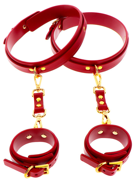 Produzidas em sensual pele vegano Bordeaux com ferragens douradas, estas algemas servem para prender os pulsos aos tornozelos.