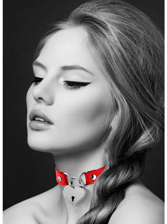 Coleira vermelha com cadeado em forma de coração.