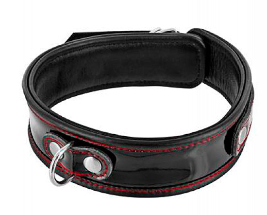 Produzido em pele genuina, esta coleira tem acabamento brilhante e uma argola para prender acessórios.