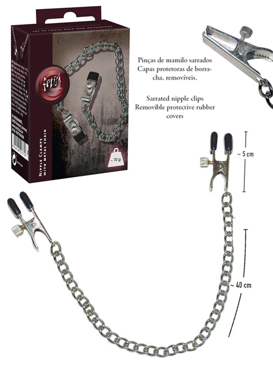 Corrente com 40cm de comprimento e pinças com pressão ajustável por parafuso.