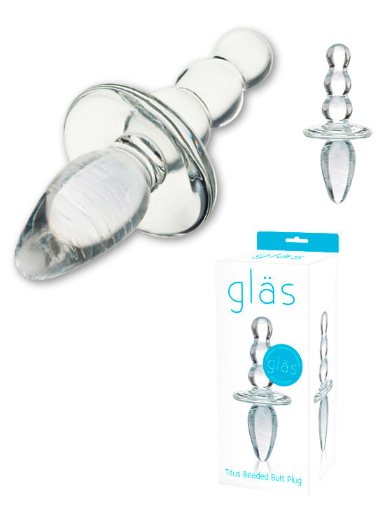 Brinquedo anal de vidro, com forma de plug numa extremidade e formato ondular na outra.